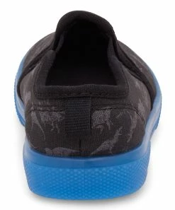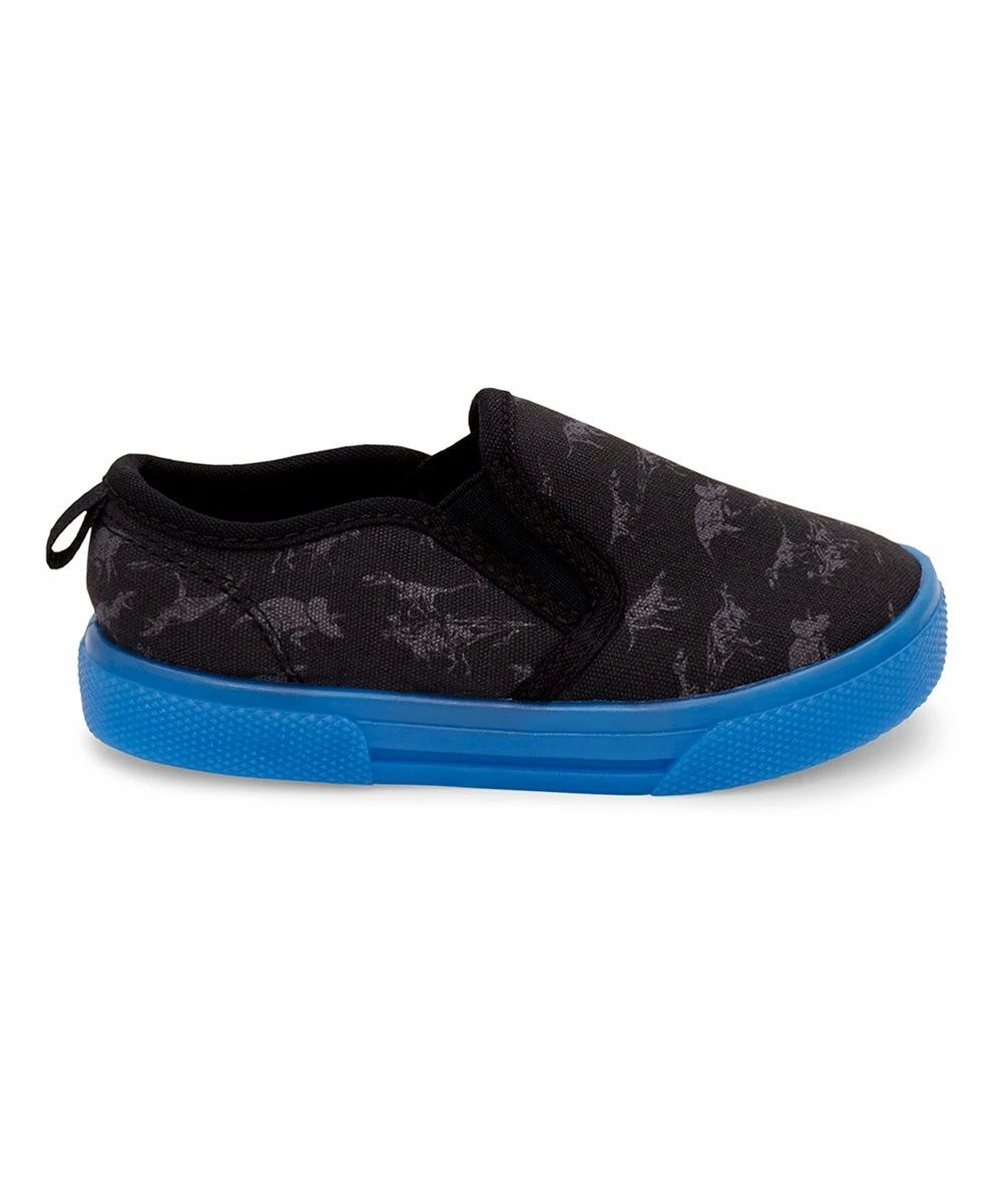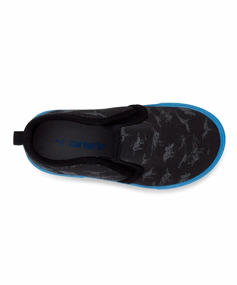 Fun dinosaur-themed canvas sneaker with stretch goring for easy slip-on styling. Machine washable.