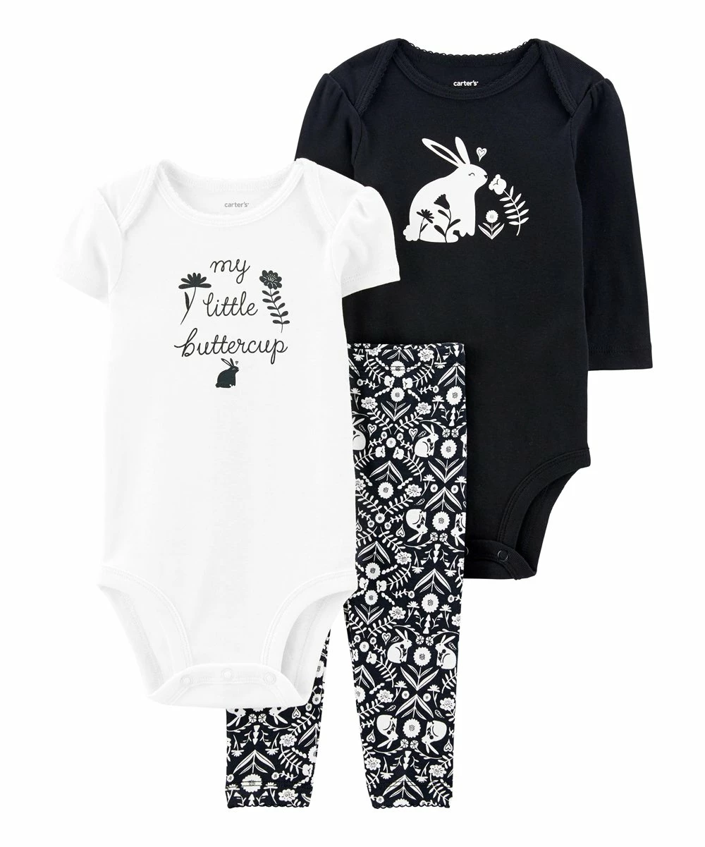 - Includes white short-sleeve bodysuit, black long-sleeve bodysuit, and black and white floral leggings (three pieces total)