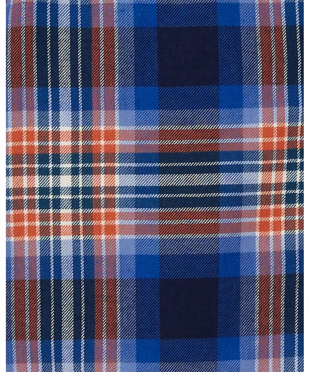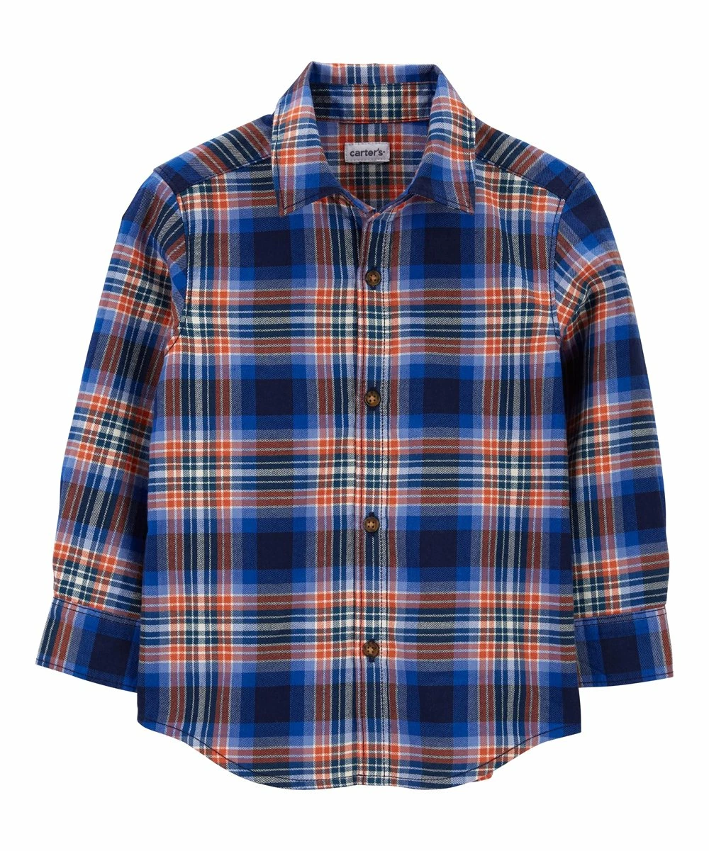 Give them a traditional look with this button-up top featuring a wing collar and plaid fabric.