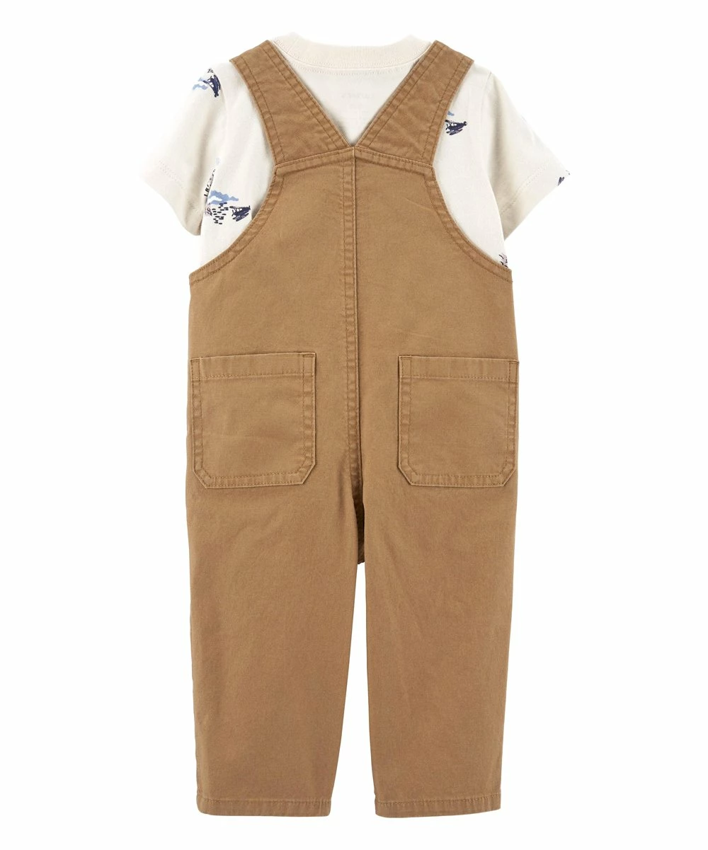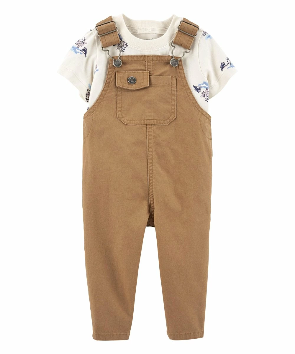 This ready-to-wear set includes a printed cotton tee and coordinating overalls with a hint of stretch.