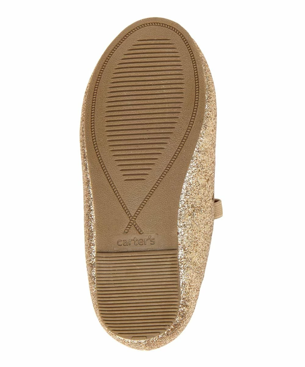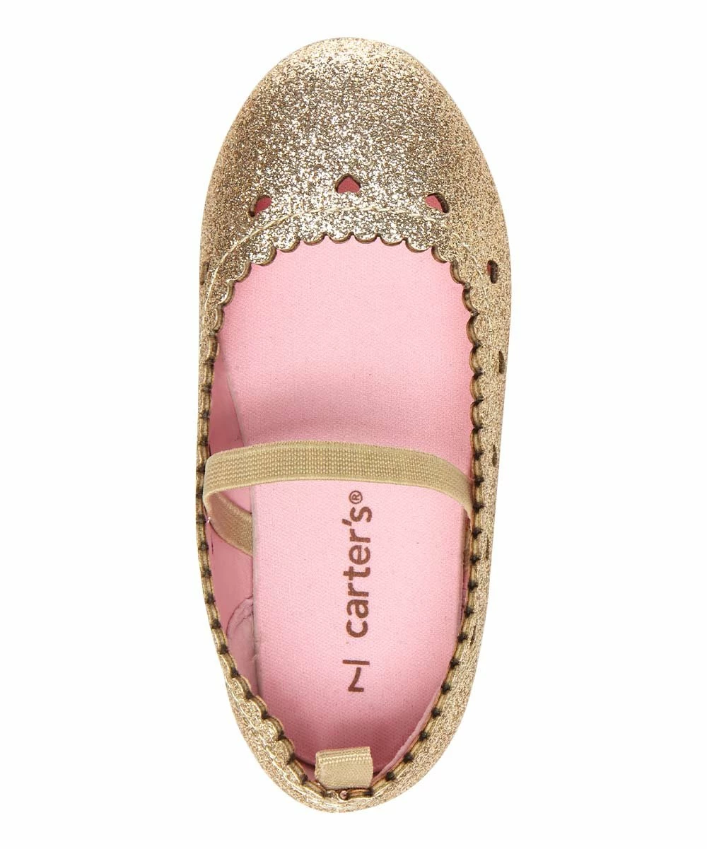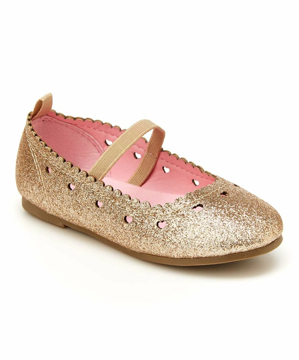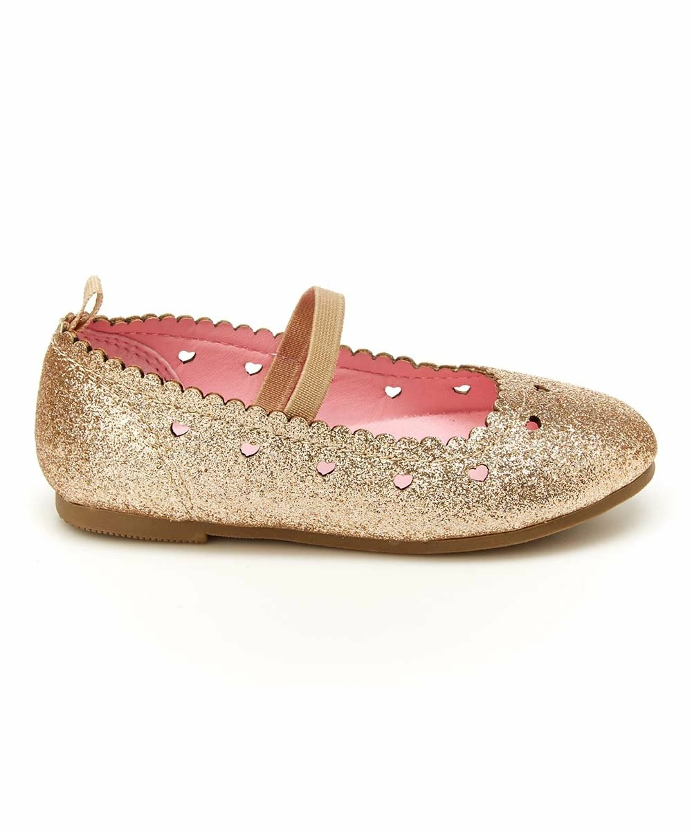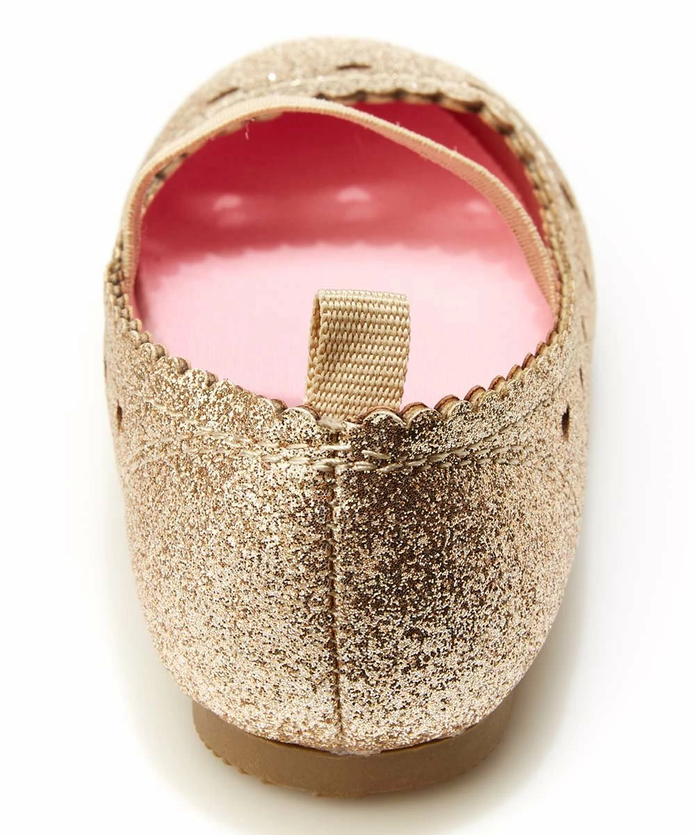 Little ones show off lovely looks in this glittering ballet flat with a scalloped edge and tiny heart cutouts.