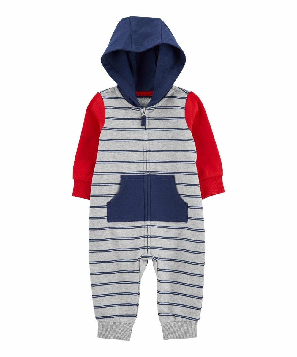 This adorable one-piece playsuit features cotton-blend fabric and a hooded design for extra coziness.