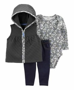 - Includes gray hooded quilted vest, gray and periwinkle floral long-sleeve bodysuit, and navy pants (three pieces total)
