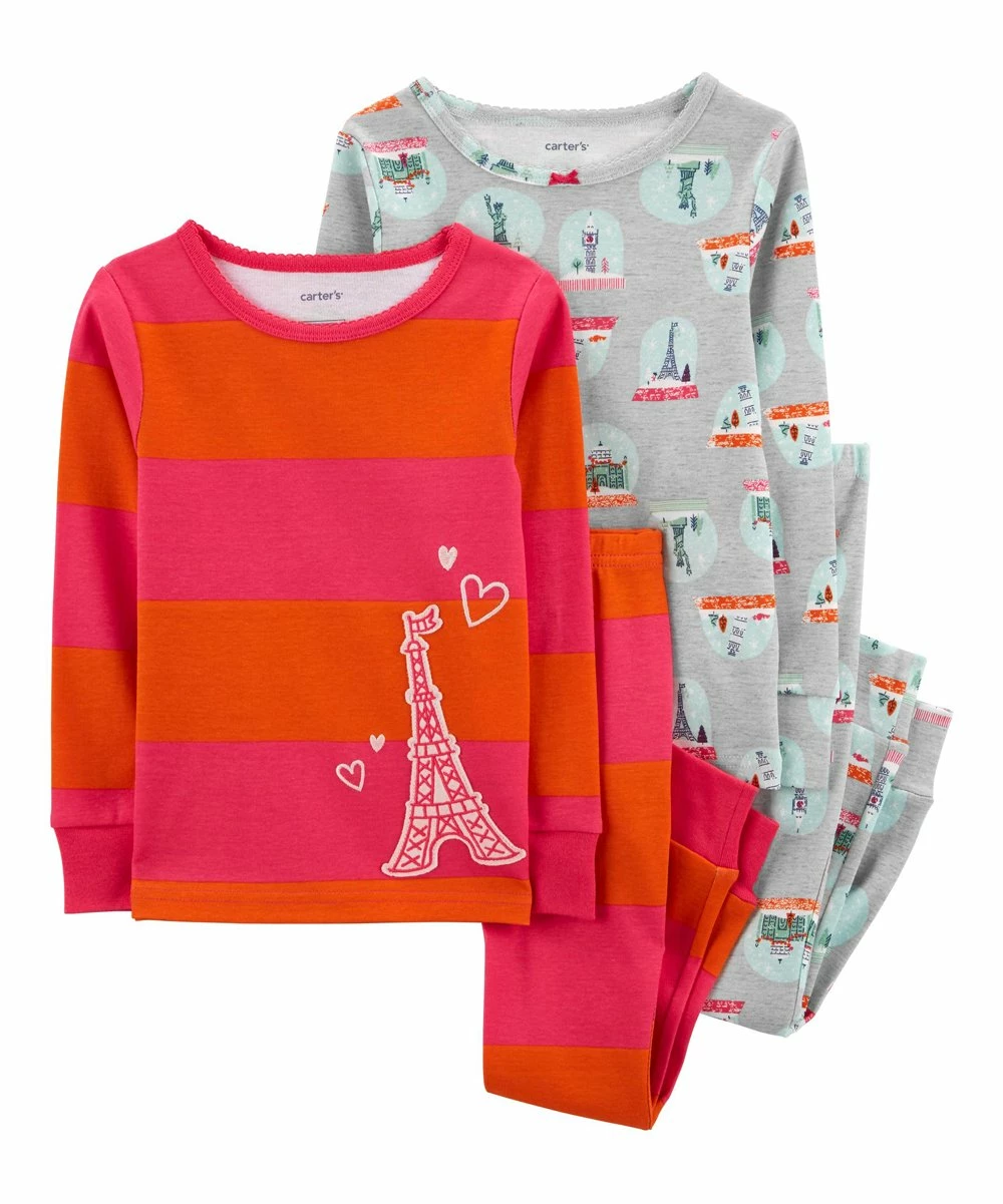 - Includes gray Paris snow globes long-sleeve pajama top, gray Paris snow globes pajama pants, red and pink stripe Eiffel Tower long-sleeve pajama top, and red and pink stripe pajama pants (four pieces total)