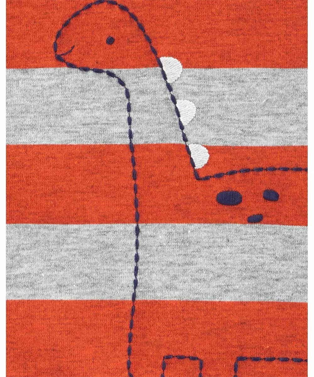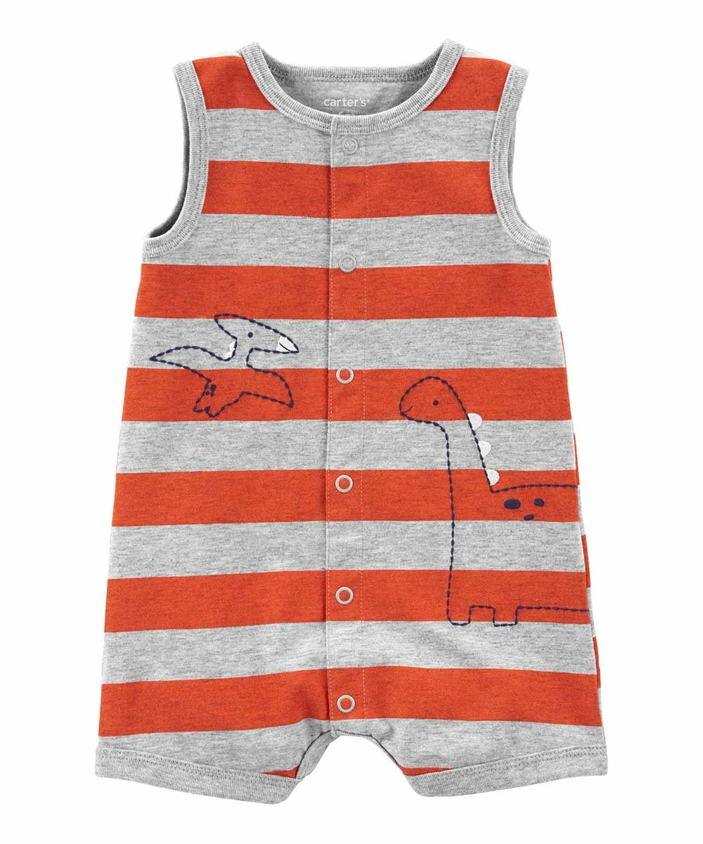 Get Baby changed and dressed in a jiff with this sleeveless romper’s snap closures. It has a stripe pattern and stitch dinosaur designs for charming looks.