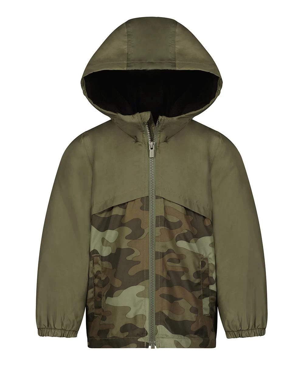 This coat features a midweight design with a colorful camo motif and an attached hood. Two front welt pockets.