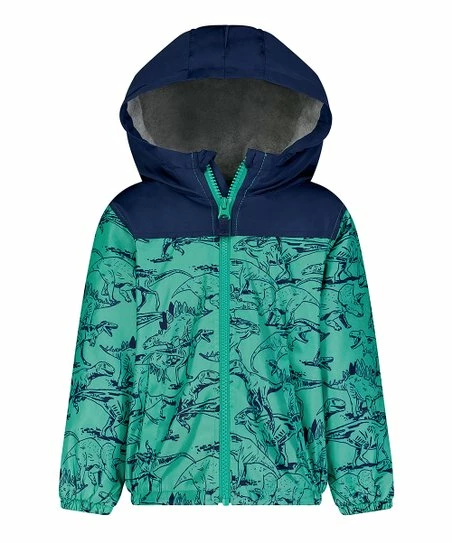 Zip-up jacket featuring an attached hood and dynamic dino motif. Two front welt pockets.