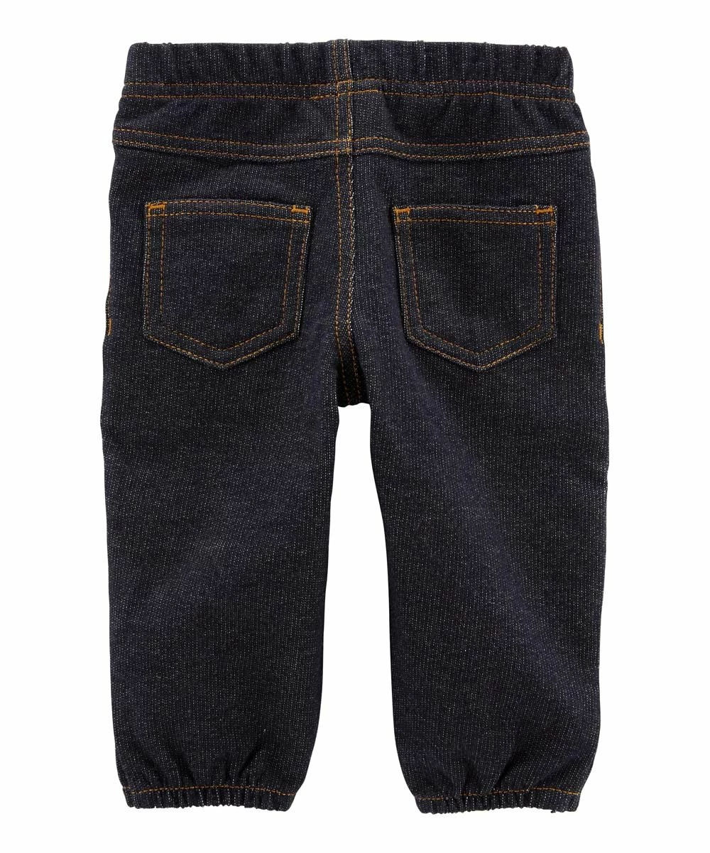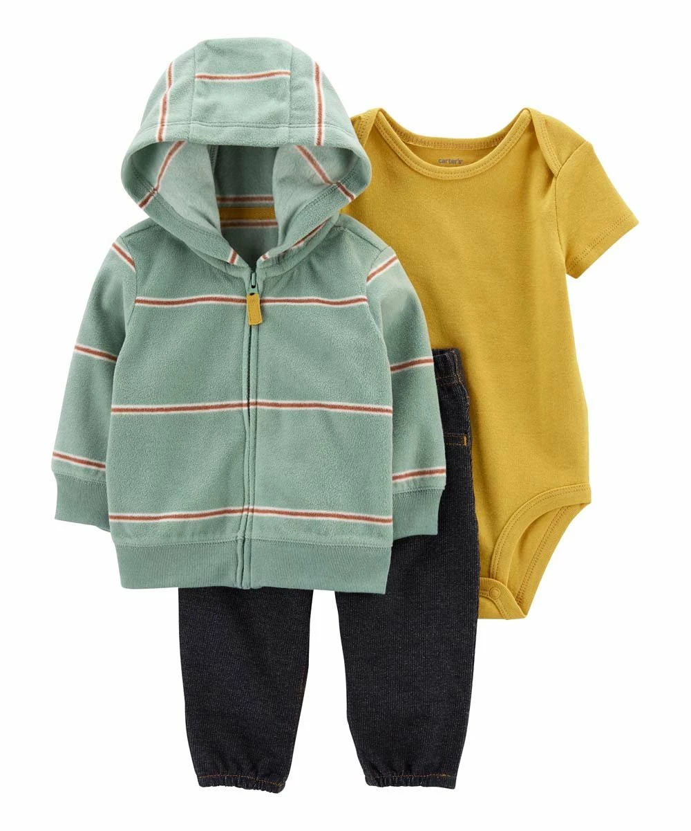 A cozy, microfleece cardigan is paired with an all-cotton bodysuit and jeans for a complete look that puts comfort and practicality at the forefront.