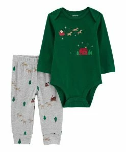 - Includes one green long-sleeve bodysuit and one pair gray & green tree sketch joggers (two pieces total)