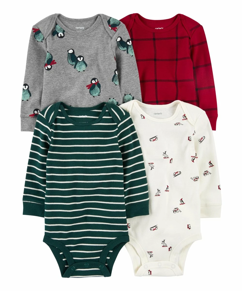 - Includes one green and white bodysuit, one red and black windowpane bodysuit, one gray and green penguin bodysuit and one white & green arctic animals bodysuit (four pieces total)