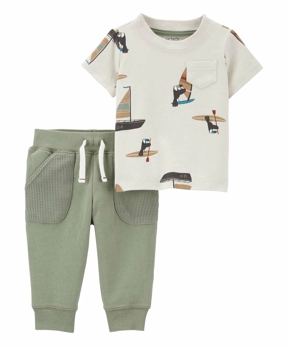 - Includes one ivory crewneck tee and one pair of green pants (two pieces total)