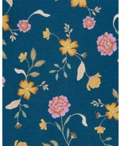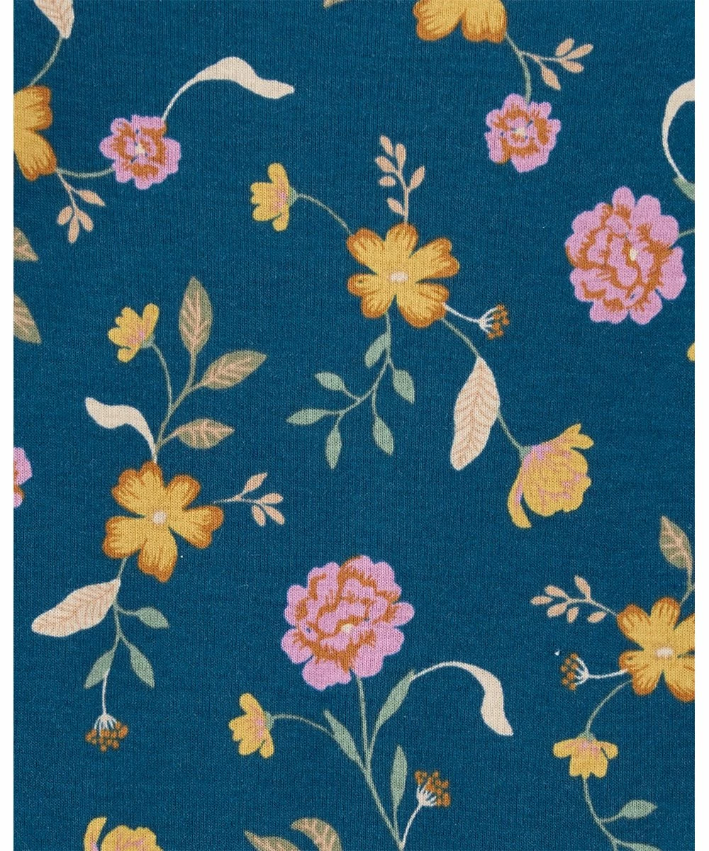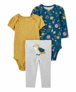 - Includes mustard dot short-sleeve bodysuit, dark blue floral long-sleeve bodysuit, and gray bird leggings (three pieces total)