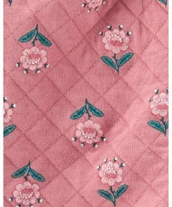 - Includes pink floral quilted vest, heather gray long-sleeve bodysuit, and light pink stripe pants (three pieces total)