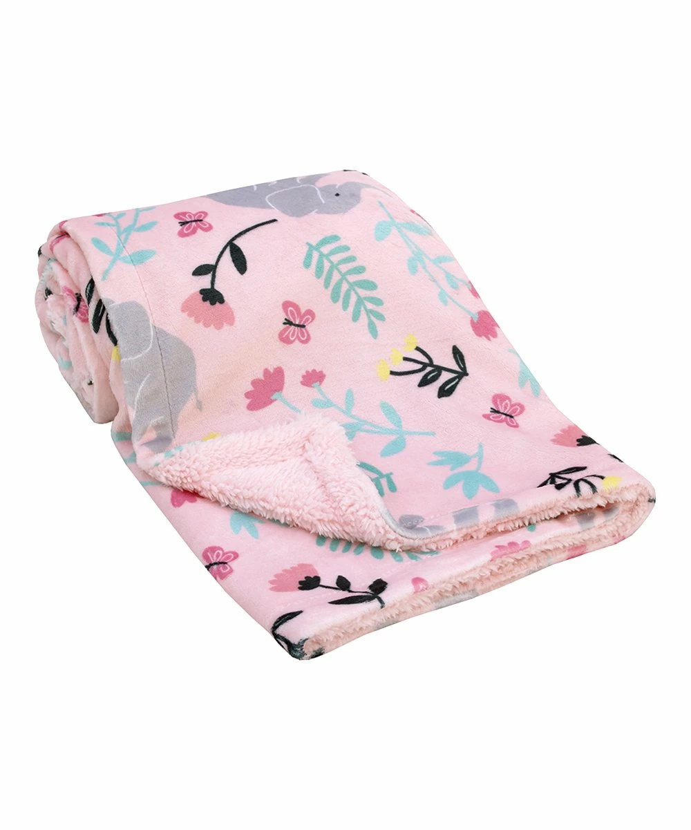 A fuzzy sherpa backing and blooming elephant print make this stroller blanket bright and cheerful.