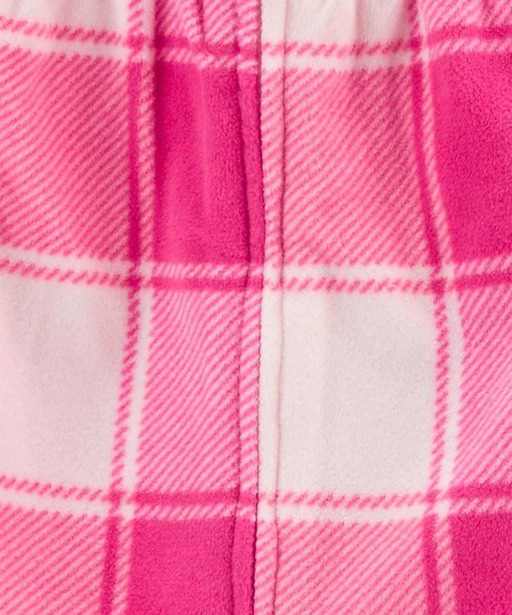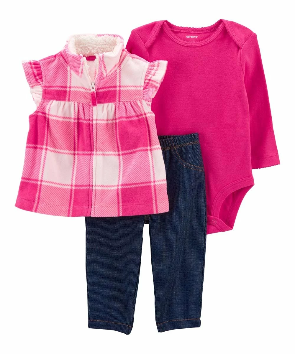 - Includes one pink and white plaid fleece angel-sleeve top, one hot pink long-sleeve bodysuit and one pair of dark blue jeans (three pieces total)