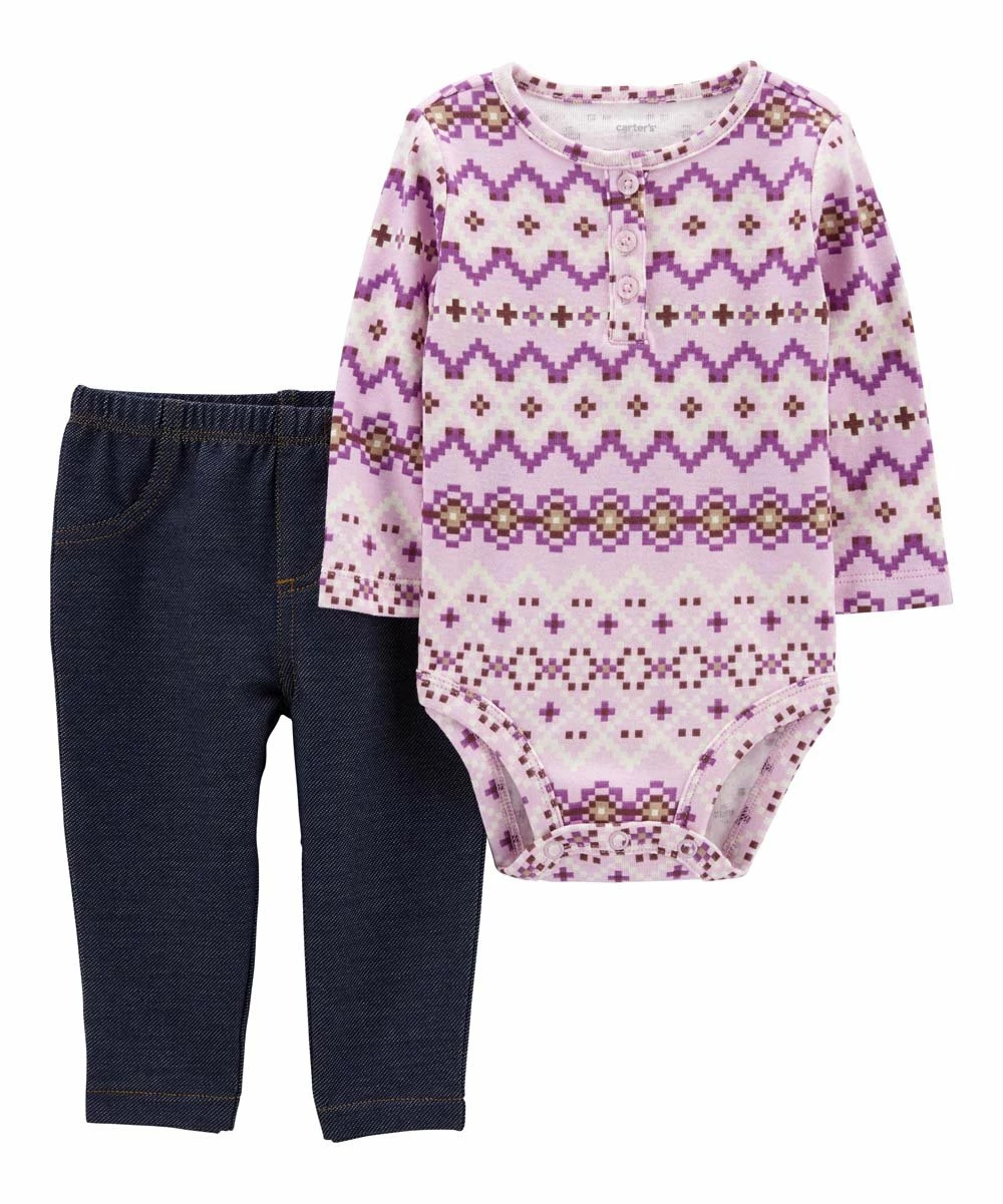 - Includes one purple and white geometric henley bodysuit and one pair of navy jeans (two pieces total)