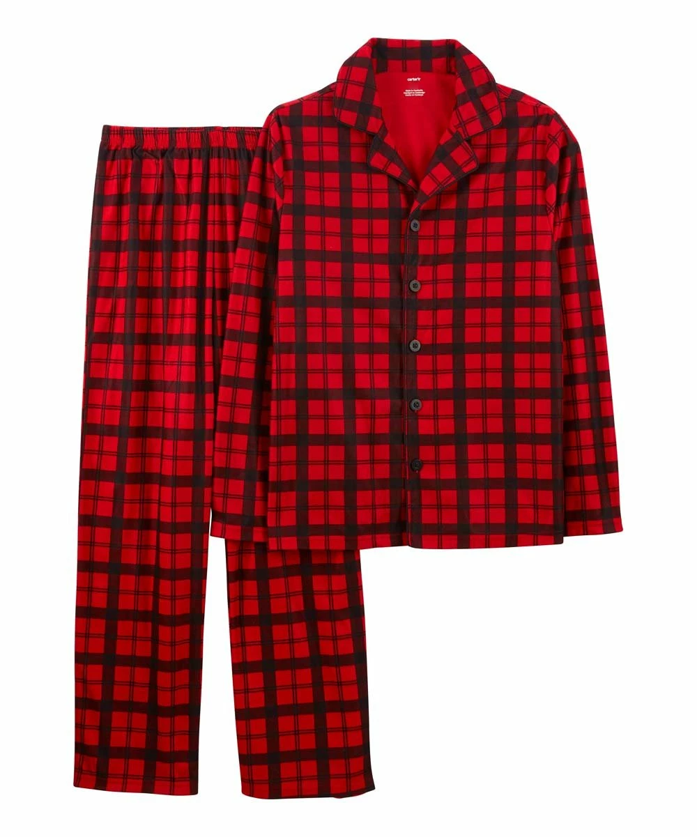 - Includes one red and black plaid pajama top and one pair of red and black plaid pajama bottoms (two pieces total)