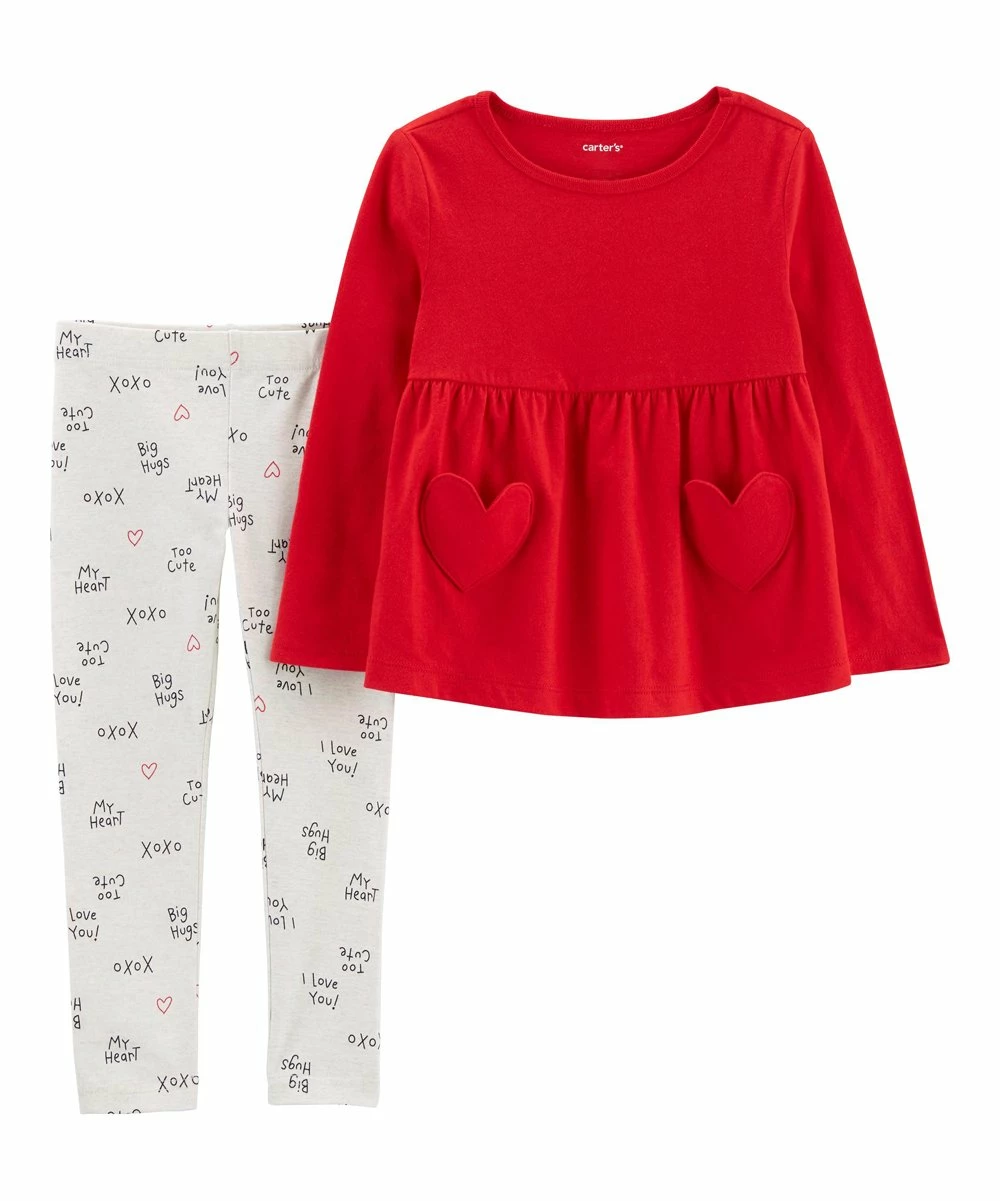 - Includes red heart-pocket long-sleeve top and white leggings (two pieces total)