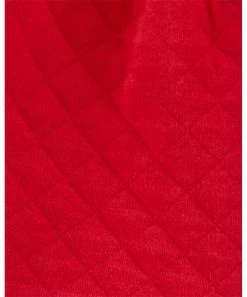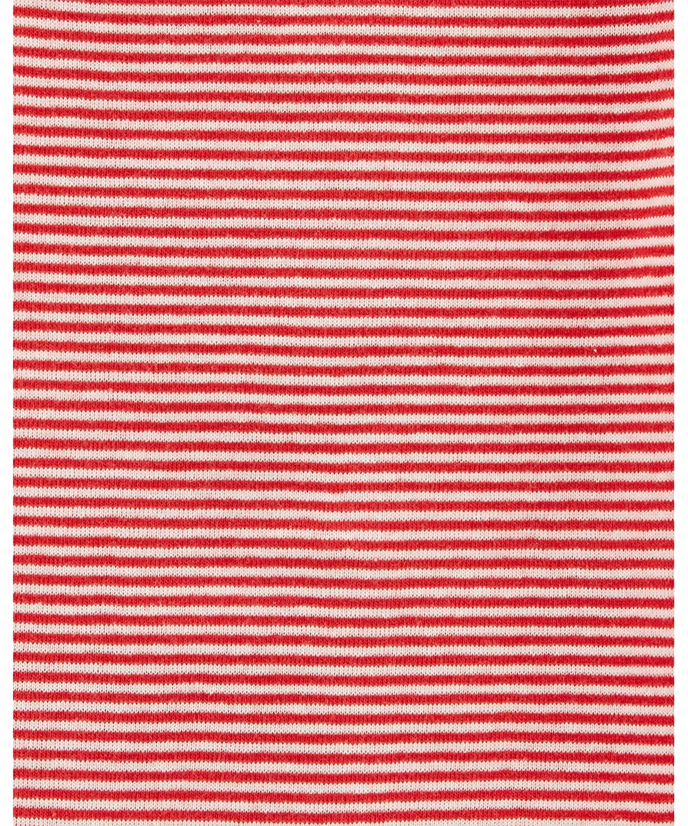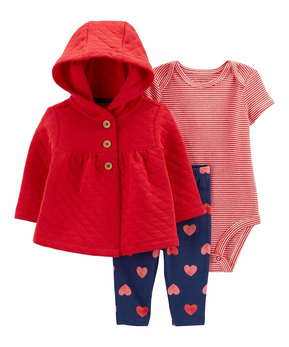 - Includes red quilted button-up jacket, red and white stripe short-sleeve bodysuit, and navy heart pants (three pieces total)