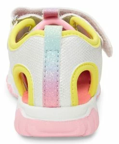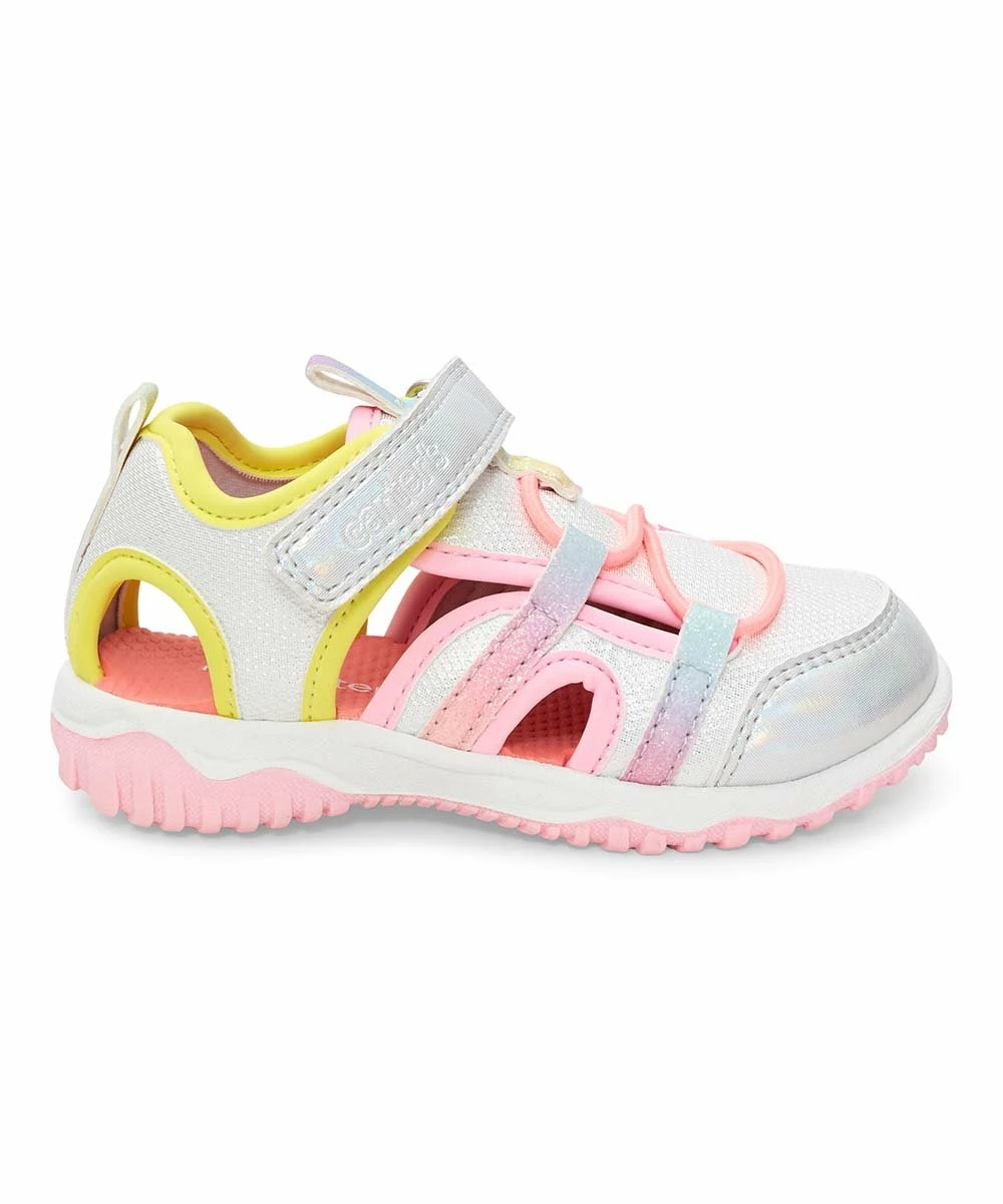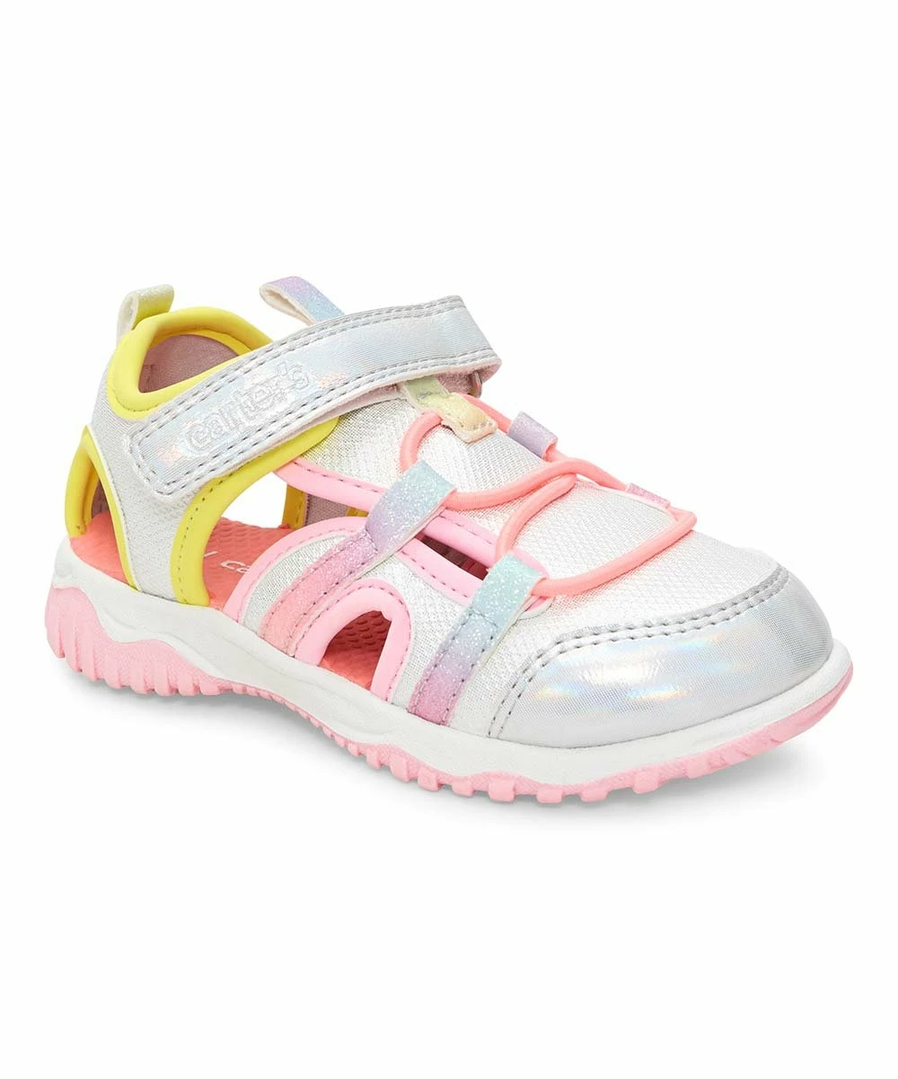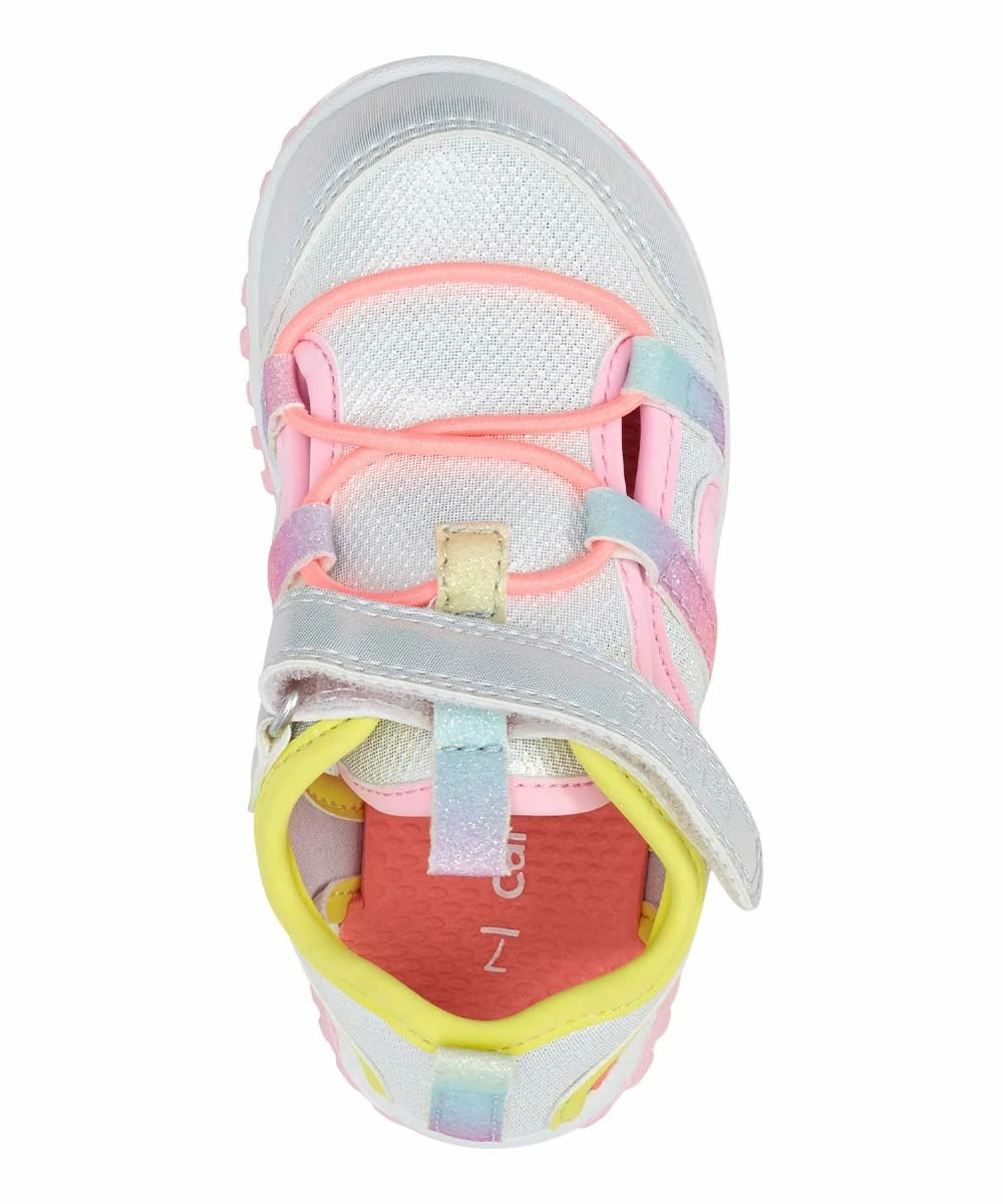 Sporty sneakers featuring a colorful design and convenient hook and loop strap.