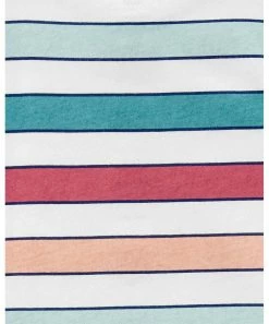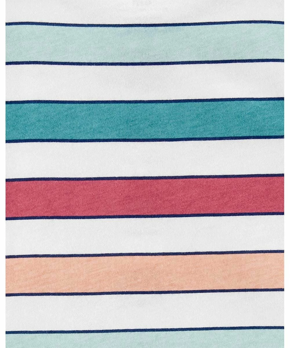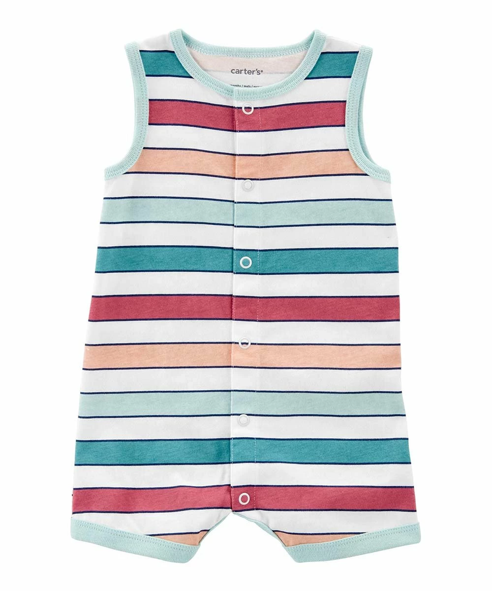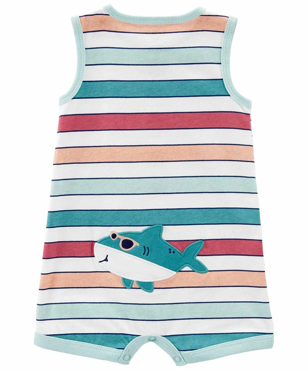 Get Baby changed and dressed in a jiff with this sleeveless romper’s snap closures. It has a colorful stripe pattern and cool shark appliqué for charming looks.
