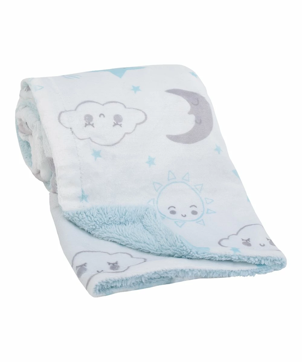 Cozy baby blanket with an eye-catching pattern and supersoft sherpa-backed fabric.