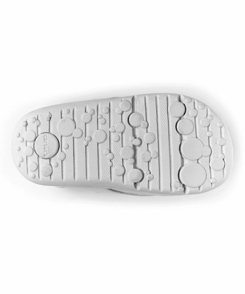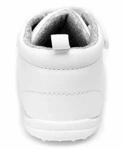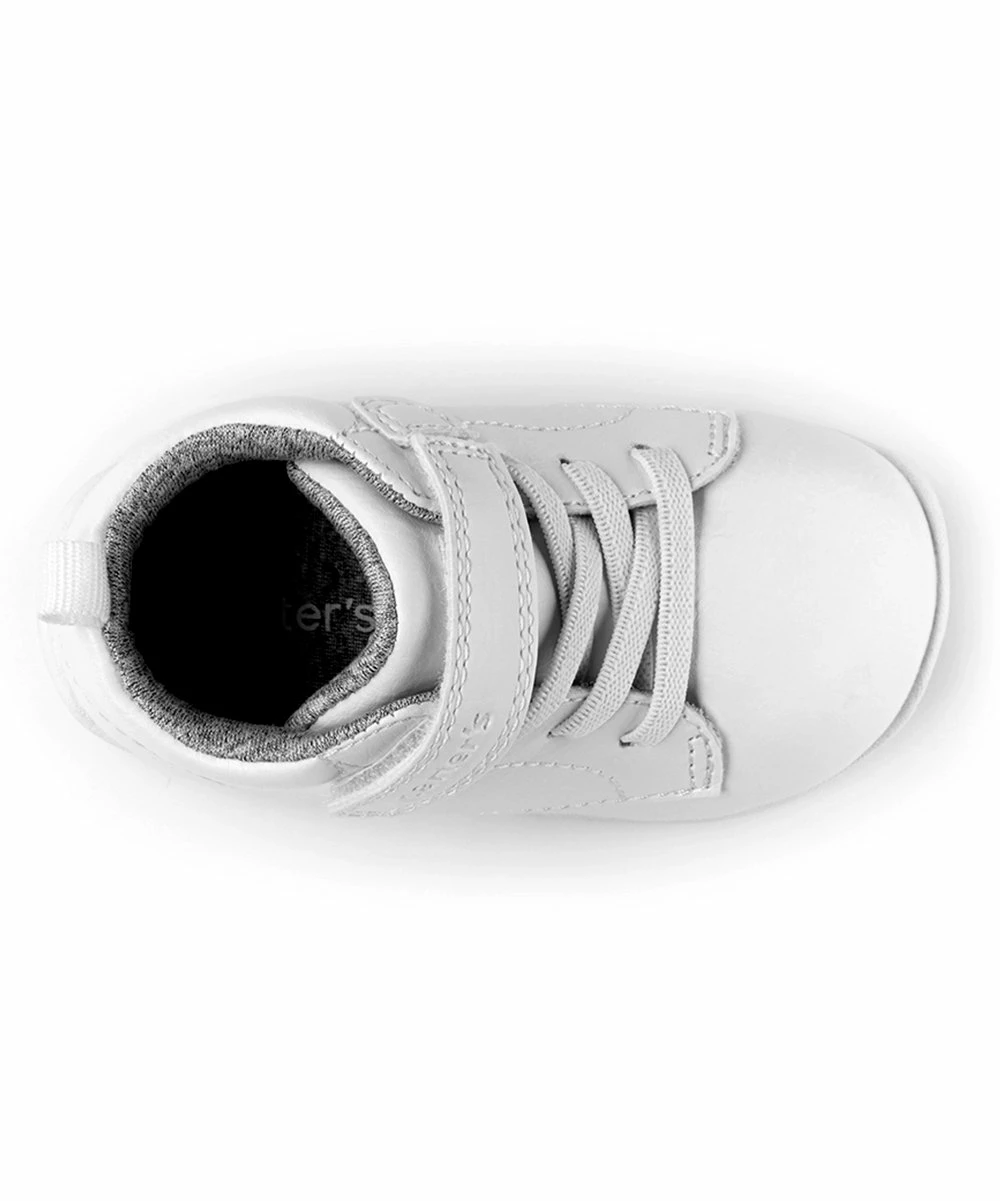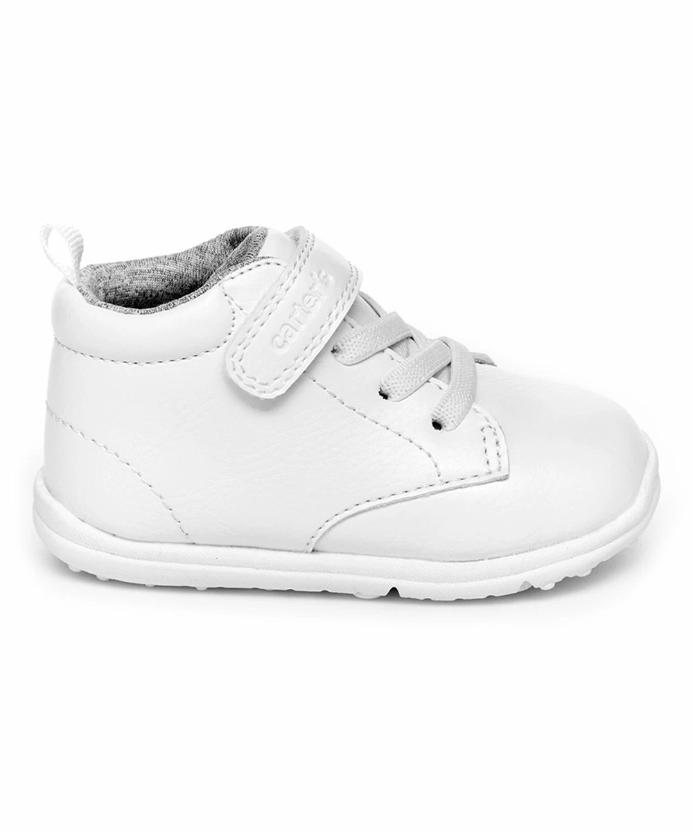 A first-steps sneaker with a padded insole, faux laces for easy pull-on and a hook-and-loop ankle strap for a secure fit.