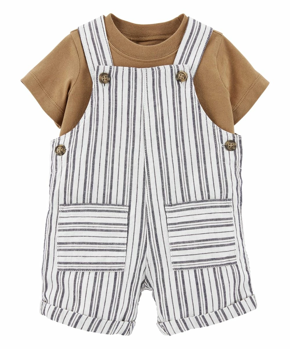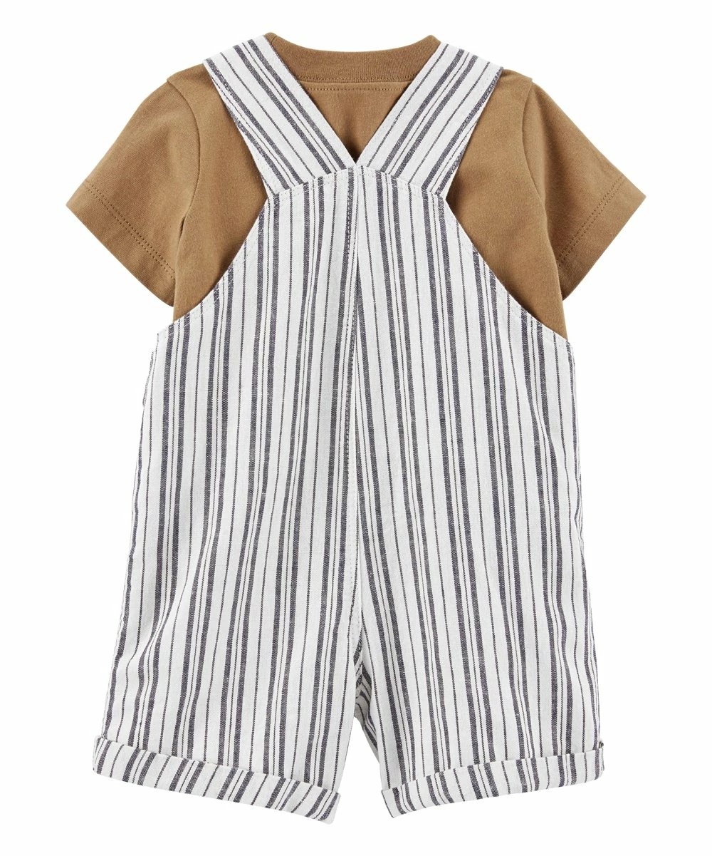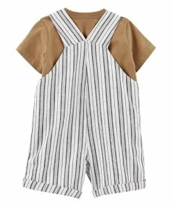 - Includes white stripe shortalls and brown tee (two pieces total)