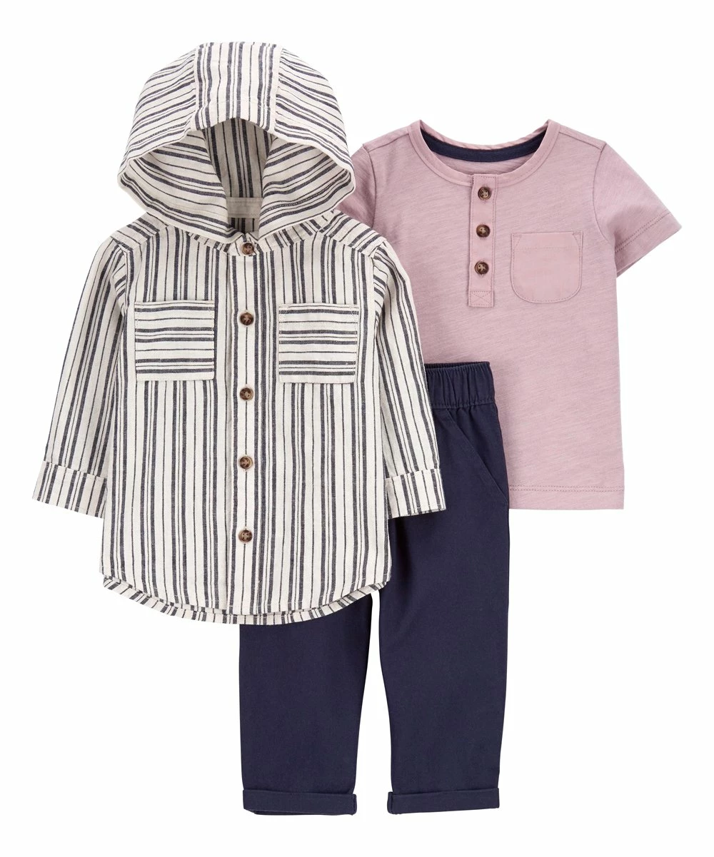 - Includes white stripe jacket, pink button-front tee and navy pants (three pieces total)