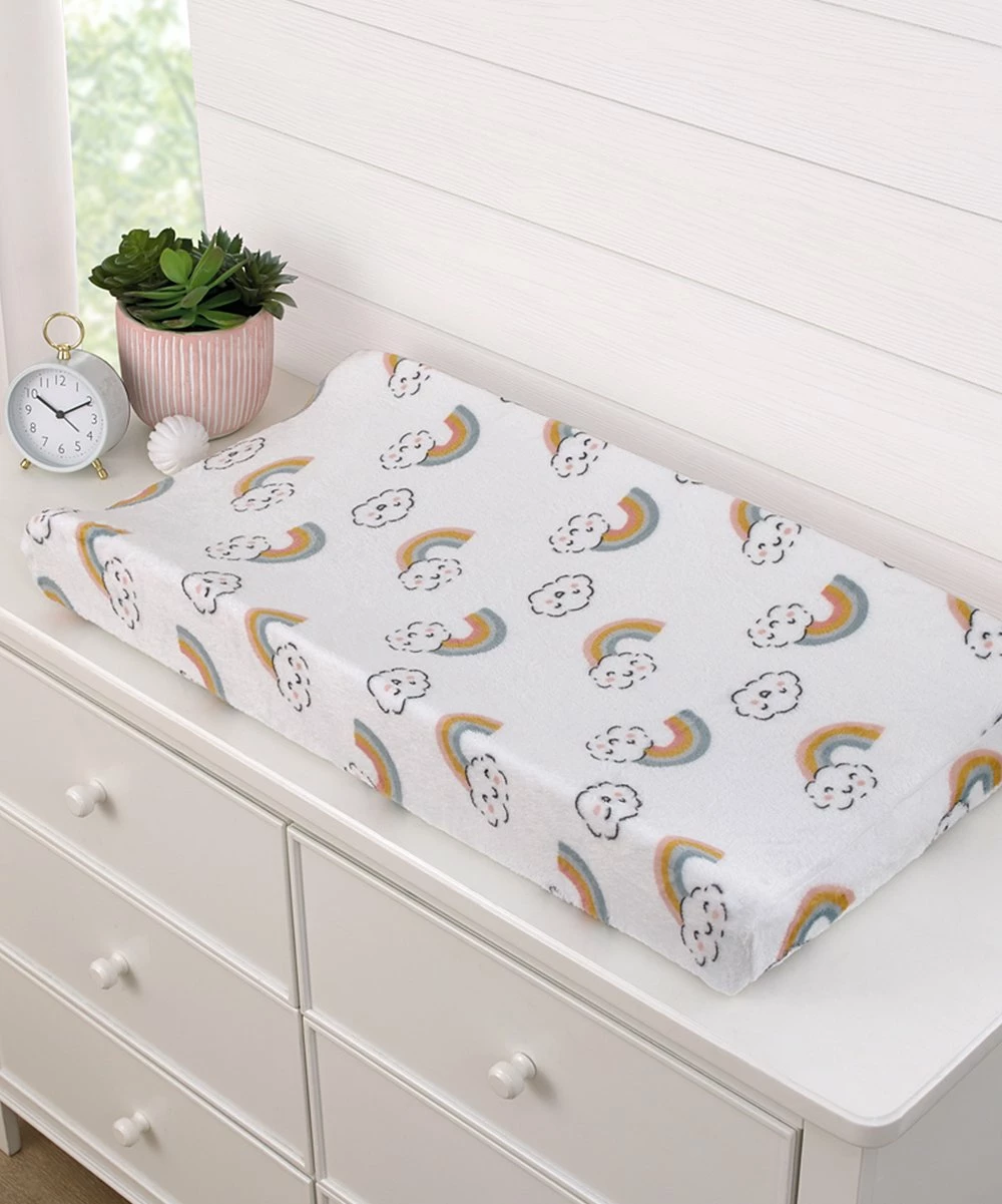 Make Baby’s room cheerful with the rainbow and clouds pattern of this machine-washable changing pad cover.