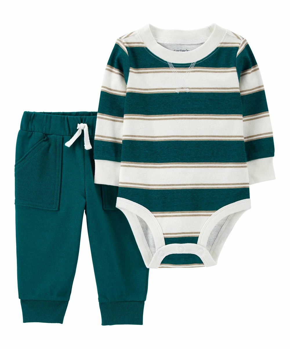 - Includes white and dark green stripe long-sleeve bodysuit and dark green sweatpants (two pieces total)