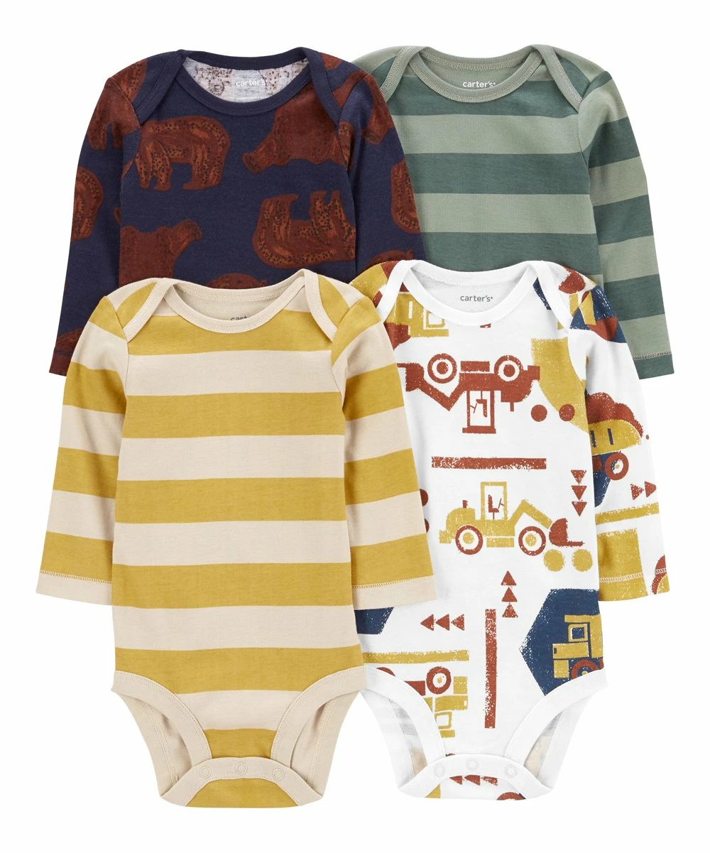 - Includes four long-sleeve bodysuits, one each in navy and brown bear, green stripe, yellow stripe, and yellow and white construction