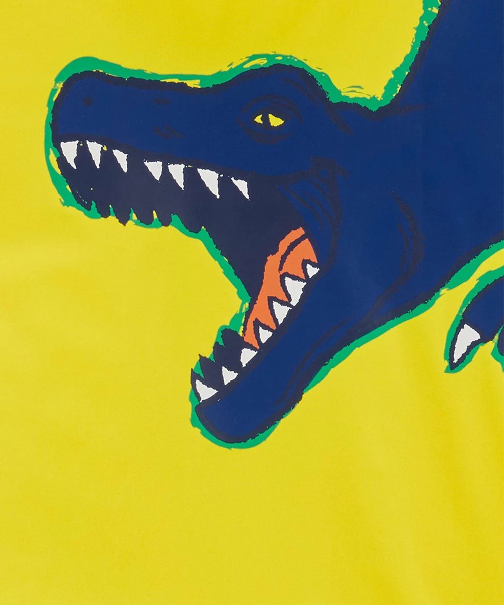 - Includes a yellow and navy dinosaur rashguard and navy dinosaur swim trunks (two pieces total)