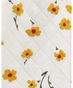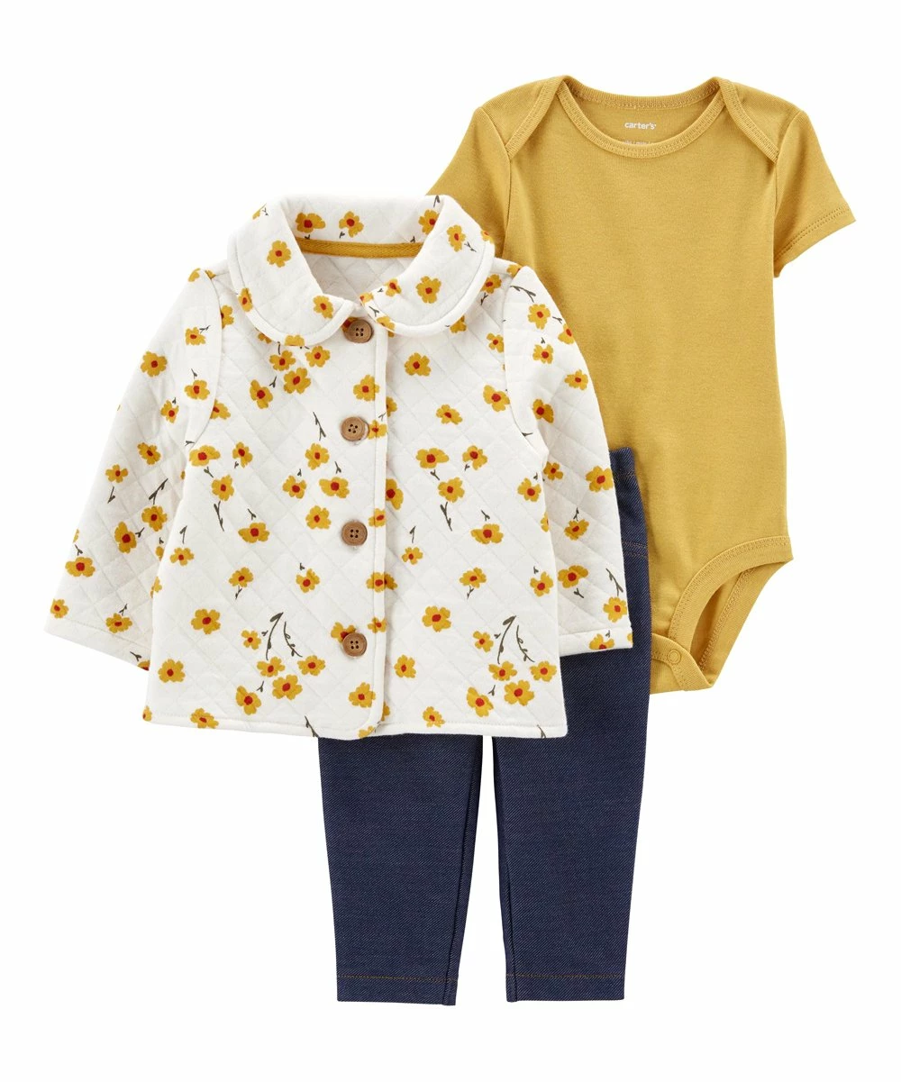 - Includes yellow and white floral quilted button-up cardigan, yellow short-sleeve bodysuit, and navy pants (three pieces total)
